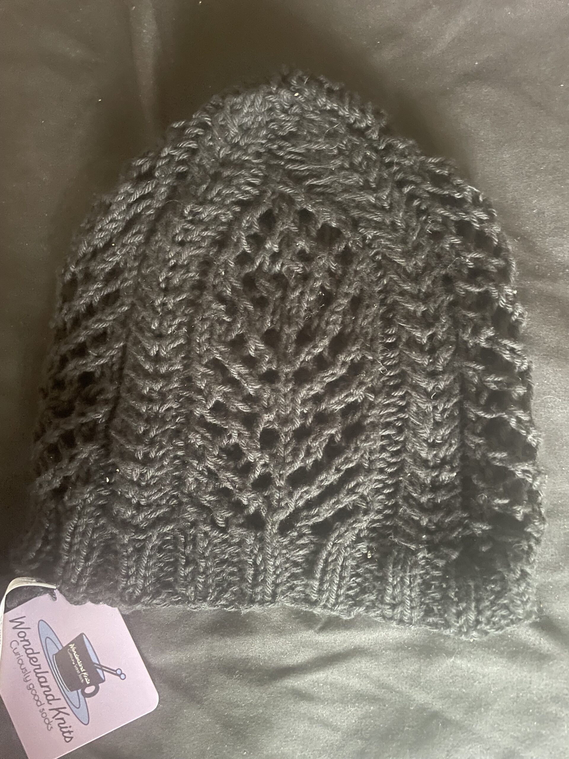 Black lace and cable hat. Keep your head warm without being too warm.